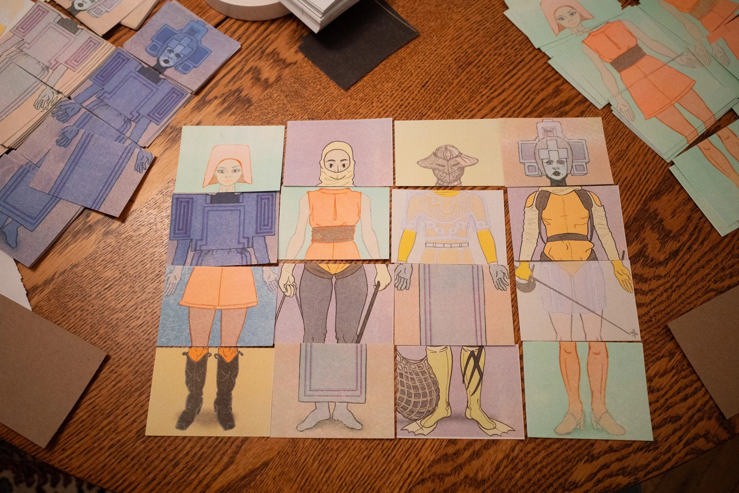 figure made of 4 random 2.5x3.5” risograph cards